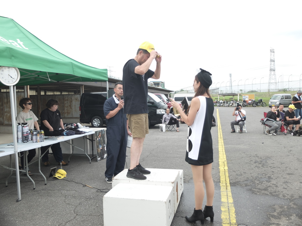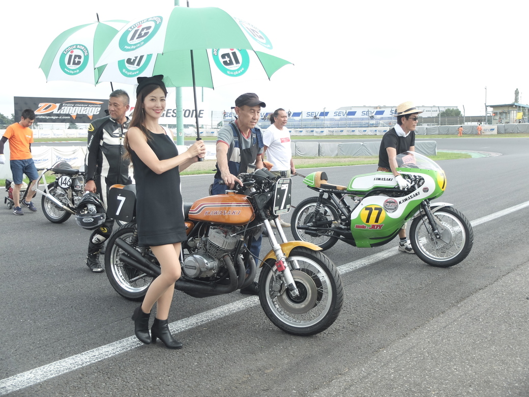 今回もNorton Manxに乗ってシニアAクラスで優勝した土井敬一さんが表彰台で、「朝来たらiB Ladyがおらへんので、なんかしょぼいなあ、と思っとったら、こうやっていてくれたんでよかったわ〜〜!」と持ち上げてくださってましたね。
