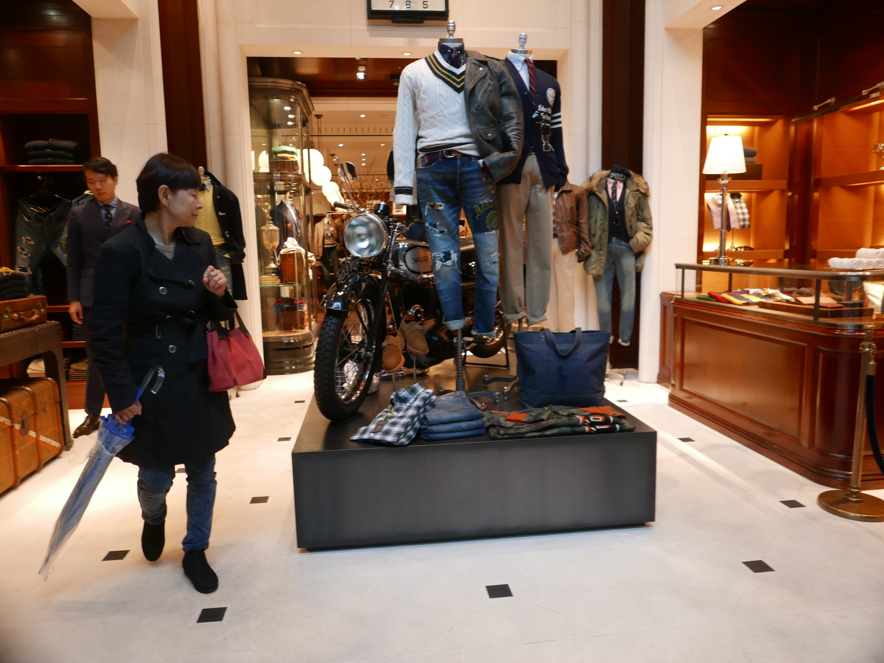 ヒルズを出てラルフ・ローレンに行くと、メインの入り口にヴィンセントが飾ってありました。旗艦店である表参道店が全体として4輪も含めたクラシック・モータースポーツに触発されたイメージで統一されていました。