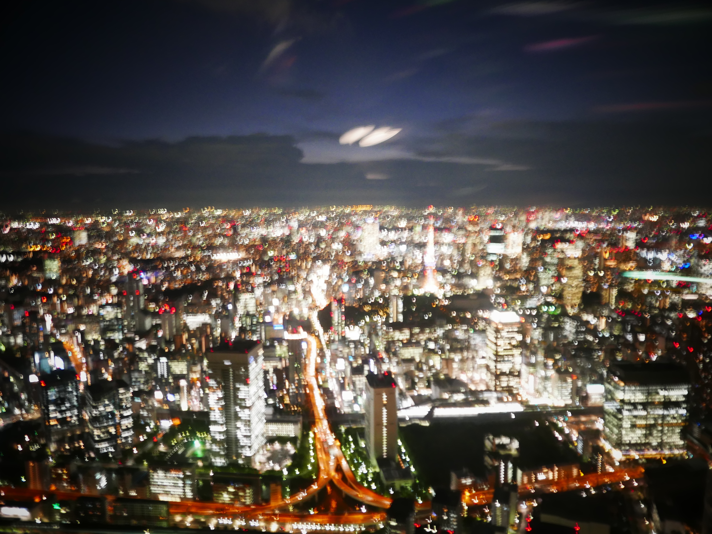 でも、ヘリで空中にでると、また全然違うんです。自分の周囲の世界のどこにも現実世界はなくなってしまうんです。ヘリの中は真っ暗でエンジンの轟音と振動に包まれています。目に映るのは、TOKYOが光のオブジェのようになった地上の銀河のみ。昨日は曇っていたので、その光が雲を照らすんです。下から上まで光のページェント。その中で自分は宙に浮いているんです! なんという非現実感。自分自身が巨大なアートの中に溶け込んでしまったような、、、。実際、外から見たヘリは空中で見えず僕らはきっと点滅する光であった、、、。